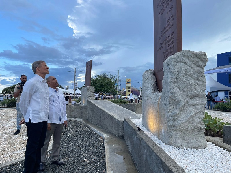 El Canciller dominicano Roberto Álvarez observa y lee, junto al periodista y escritor petromacorisano Enrique Cabrera Vásquez (Mellizo), fragmentos del poema , «Los Inmigrantes», del poeta Norberto James Rawlings, incrustados en algunas de las planchas de acero del monumento erigido a los cocolos