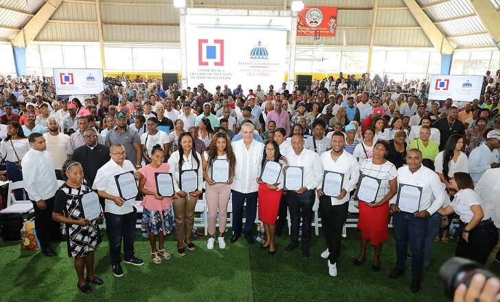 SAN PEDRO DE MACORIS, domingo 13 de julio 2025.- El presidente Luis Abinader entregó el pasado sábado 1,800 títulos de propiedad en beneficio de 7,200 personas en el municipio Quisqueya de San Pedro de Macorís.