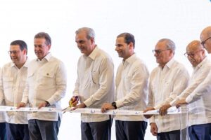 Foto.- 1, el presidente Luis Abinader junto a Frank Elías Rainieri y su padre Frank Rainieri, del Grupo Puntacana, en el corte de cinta inaugural de Punta Cana Free Trade Zone.