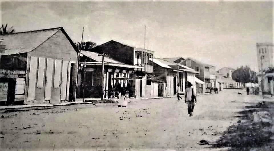 Foto de la calle Independencia de San Pedro de Macorís del año de 1890. En esa época era conocida como calle el comercio, nombre que mantuvo hasta las primeras décadas de 1900. La vista panorámica muestra a la derecha del fondo, el existente Reloj Publico, construido en mampostería (ladrillos) en el año de 1902, en el Parque Salvador Ross. Este reloj duro hasta el año 1910, año cuando se iniciaron los trabajos de reforzamientos y extensión en la altura para agregarlo a los trabajos de construcción a la estructura de la iglesia San Pedro Apóstol. Fuente de la imagen: AGN Y ARCHIVOS DE IMÁGENES DE LA HISTORIA DE SAN PEDRO DE MACORIS.