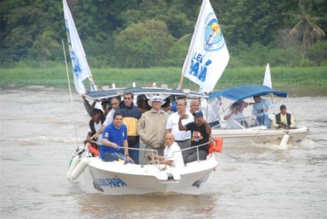 Nevegando. Hipólito Mejía durante un recorrido de campaña, en bote, a través del río Ozama.